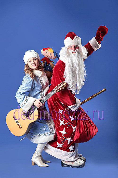 Программу проводят два актера, которые играют роли трех персонажей: Снегурочка, Дед Мороз и Баба-Яга.Дед Мороз - играет на гитаре,